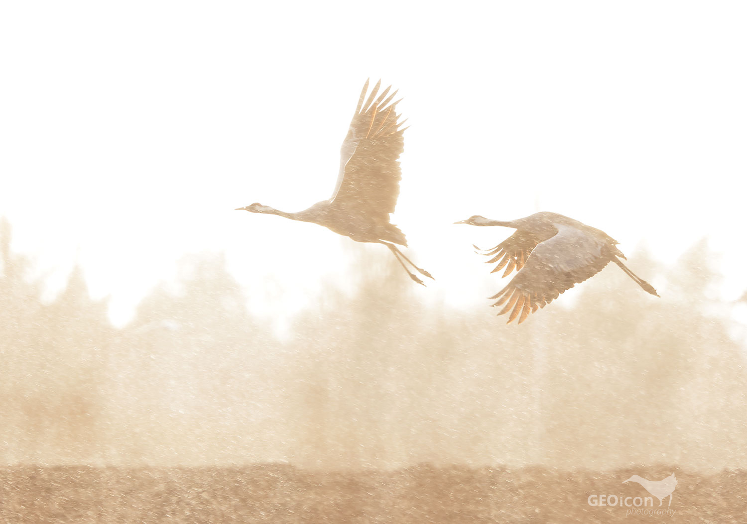 Jeřábi letící v dešti v protisvětle zapadajícího slunce. Nevyfoť to!